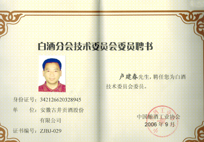 白酒分會(huì)技術(shù)委員會(huì)委員聘書