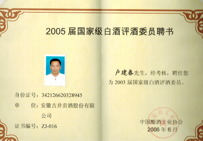 2005屆國家級(jí)白酒評(píng)酒委員聘書