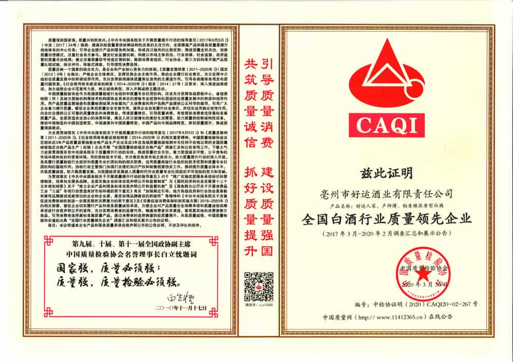 全國白酒行業(yè)質(zhì)量領先企業(yè)